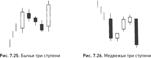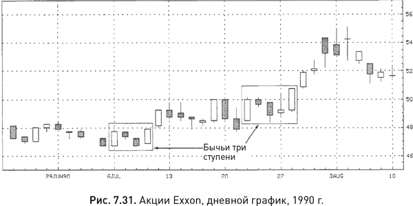 На рисунке 7.27 представлены классические бычьи три ступени. В период восходящего тренда возникли три последовательно понижающиеся черные маленькие свечи, которые предваряла белая свеча. Свечи с черными телами преимущественно лежали в границах белого тела, а после них шла еще одна белая свеча с ценой закрытия выше, чем у первой свечи модели. Значимость моделей «три ступени» повышается, если при образовании первой и последней длинных свечей объем торгов оказывается выше, чем при формировании маленьких свечей. В данном случае он возрос, когда появлялись длинные белые свечи.