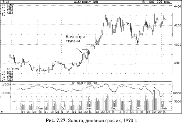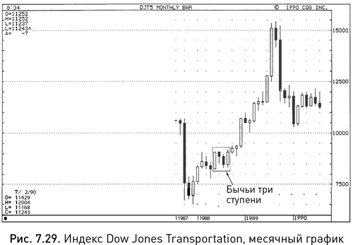 Хотя в идеале в бычьи три ступени должны входить три свечи с короткими телами, на рисунке 7.29 вы найдете вариант этой модели, в котором присутствуют только две таких свечи. Движение цен в июне 1988 г. сформировало свечу с длинным белым телом, затем в июле и августе возникли маленькие свечи, лежащие в границах ее диапазона, а в сентябре образовалась еще одна белая свеча. В процессе ее образовании рынок достигал локального максимума, однако в итоге цене закрытия не хватило трех тиков, чтобы подняться выше верхней границы тела первой белой свечи. Конечно, хорошо было бы увидеть закрытие на более высокой отметке, но и сложившуюся комбинацию свечей можно рассматривать как бычьи три ступени, если его подтвердит свеча, идущая следом. В данном случае таким подтверждением послужило то, что рынок закрылся в октябре на более высокой отметке.