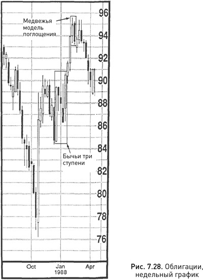 На рисунке 7.28 также можно видеть модель «бычьи три ступени». После того как она полностью сформировалась, цены продолжили подниматься вплоть до образования медвежьей модели поглощения.