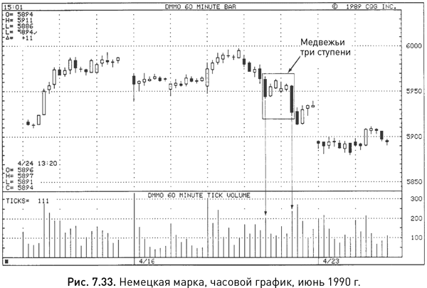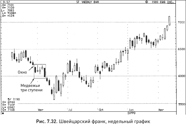 В марте – апреле 1989 г. события на рынке французского франка развивались по классическому сценарию, при котором во время коррекции цена возвращаются к ранее открытому окну, а затем возобновляется предыдущий тренд (см. рис. 7.32). После образования окна вслед за черной свечой на графике появились три маленьких белых свечи. Дебютная попытка штурмовать диапазон, заданный окном, была предпринята в первую неделю апреля и завершилась ничем. Еще через неделю, когда формировалась третья маленькая свеча, рынок вновь попытался взять неприступный рубеж и опять потерпел фиаско. Следующая черная длинная свеча закрылась на отметке ниже цены закрытия первой черной свечи, и таким образом завершилось формирование медвежьих трех ступеней.