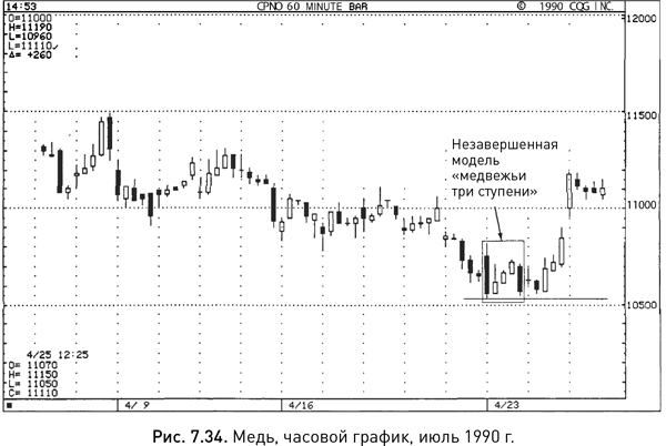 Часовой график на рисунке 7.34 напоминает нам о правиле не предпринимать никаких действий до тех пор, пока та или иная модель не сформируется до конца. В данном случае в первый час торгов 23 апреля возникла длинная белая свеча, а следом за ней – три ступенчато повышающихся свечи с маленькими телами. Но поскольку пятая свеча этой комбинации не смогла закрыться ниже первой, модель «медвежьи три ступени» так и не сформировалась. Если бы следующая свеча подтвердила медвежий сигнал, то получившуюся комбинацию все-таки можно было бы рассматривать как разновидность медвежьих трех ступеней, раз уж цены закрытия первой и последней черных свечей оказались настолько близки. Но подтверждения не появилось ни в ближайший час торгов, ни в следующий.