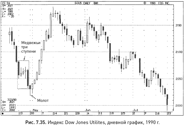 На рисунке 7.35 вы найдете классические медвежьи три ступени, сигнал которых был нивелирован молотом. Если кому-то этого оказалось недостаточно, чтобы убедиться в завершении нисходящего тренда, то дополнительным доказательством должна была послужить следующая за молотом белая свеча, образовавшая вместе с ним бычью модель поглощения.