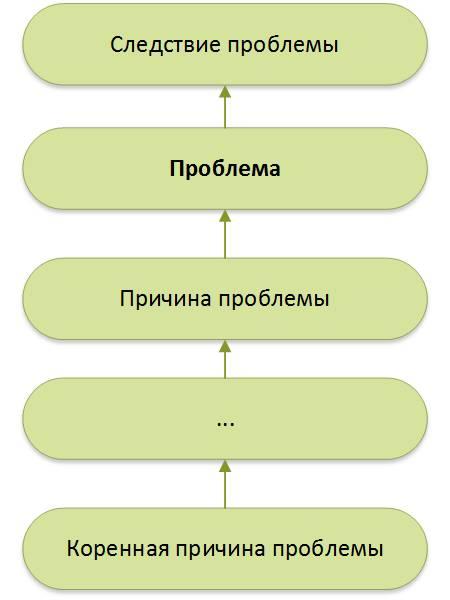 Наряду с первым этот способ также широко распространён и поверхностно описан в различных изданиях. Как правило, их применяют вместе, так как преобразование потока сводится к определению и решению отдельных, наиболее значимых проблем. Начнём с формулировки проблемы, как с наиболее распространённой ошибки в начале применения этого способа. От точности формулировки проблемы зависит как её понимание МФГ, так и дальнейшая судьба: быть или не быть. Часто в определение проблемы вкладывают желание, следствие либо предполагаемую причину возникновения проблемы. Например, такая формулировка, как «отсутствие гаечного ключа на 15 позиции», является неправильной, так как это либо желание (если потребность в ключе не обоснована), либо предполагаемая причина проблемы «превышение времени затяжки кронштейна». Проблема «сверхурочная работа участка № …» тоже является неправильной, так как это следствие другой проблемы, например, «поломка станка №…». В определении проблемы самое главное – не пересечь тонкую грань, отделяющую проблему от причины её возникновения и её следствия. По определению lean, проблема – отклонение от стандарта (отсутствие стандарта также проблема). Структура причин и следствий схематично выглядит следующим образом (см. рисунок 10.11).