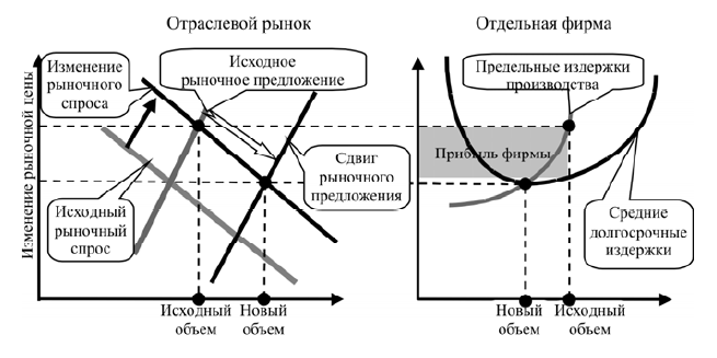 Наиболее важными аспектом анализа в модели совершенной конкуренции долгосрочного периода является механизм изменения рыночных условий, представленный на рисунке 2.3. Суть изменений связана с возможностью беспрепятственного входа на рынок новых фирм. Расширение спроса в краткосрочном периоде вызовет рост цены. Это обеспечит фирмам получение сверхприбыли, что привлечет в отрасль новых производителей. Отраслевое предложение увеличится и цена упадет. Она установится на новом уровне – уровне минимальных долгосрочных средних издержек производства. Проникновение на рынок новых фирм прекратится, а фирмы, не способные работать при таком уровне цены уйдут с рынка. Рынок окажется в состоянии равновесия при новом уровне цены.