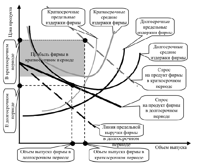 Долгосрочный период отличается от краткосрочного тем, что фирма может изменить величину своих производственных мощностей. Это обусловливает ряд особенностей в ее поведении. Во-первых, так как в долгосрочном периоде все затраты становятся переменными, а уровень производственных затрат будет характеризоваться только показателями средних долгосрочных издержек, то условием присутствия фирмы на рынке в долгосрочном периоде является обеспечение безубыточности производства. При цене ниже средних долгосрочных издержек фирма уходит с рынка. Во-вторых, имея возможность изменять все параметры производства, фирма направляет свои усилия на оптимизацию производственных мощностей, т. е. приведение их в соответствие со спросом на продукт фирмы, что даст ей дополнительную возможность для повышения эффективности производства. Поэтому кривая долгосрочных предельных издержек фирмы является более пологой в сравнении с кривой краткосрочных предельных издержек, что позволит фирме обеспечить доходную деятельность даже при более низкой цене. Поэтому фирма может позволить себе мириться с убытками в краткосрочном периоде, рассчитывая на их возмещение в процессе долгосрочной деятельности на рынке. В-третьих, в долгосрочном периоде фирма может выйти из отрасли, оптимизируя убытки путем прекращения производства, так как у нее достаточно времени для перенесения деятельности на другой, более доходный рынок.