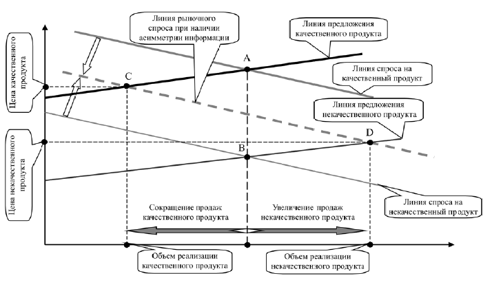 Рынок с высокой степенью асимметрии информации принято называть «рынком лимонов», так как в США «лимоном» принято называть товар со скрытыми дефектами. «Рынок лимонов» – рыночная структура, характеризующаяся наличием у продаваемых товаров значительных скрытых характеристик, а у действующих на рынке агентов – скрытых действий. Своеобразие функционирования «рынка лимонов» заключается в том, что наличие скрытых характеристик создает стимулы для недобросовестного поведения («риск безответственности»), а скрытые действия запускают механизм разрушения рынка («негативный отбор»).