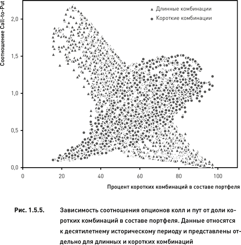 Из рис. 1.5.5 следует, что чем больше доля коротких комбинаций в составе портфеля, тем больше соотношение колл/пут в этих коротких комбинациях. В тех случаях, когда короткие комбинации составляли менее 60–70 %, они были существенно перекошены в сторону путов. Однако эта ситуация менялась, когда короткие комбинации были более многочисленны. В этих случаях коллы составляли большинство в составе коротких комбинаций. В случае с длинными комбинациями зависимость оказалась прямо противоположной: чем больше коротких комбинаций было в портфеле, тем меньше оказывалось соотношение коллов и путов в длинных комбинациях. Когда доля длинных и коротких комбинаций в портфеле была приблизительно одинаковой, в длинных комбинациях коллов оказывалось в 1,5 раза больше, а в коротких в 2 раза меньше, чем путов.