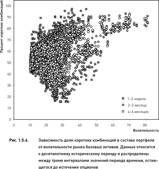 Для того чтобы осмыслить, какое значение имеют зависимости, представленные на рис. 1.5.5, для качеств базовой частично-направленной стратегии, следует обратиться к еще одной зависимости. Исследуя свойства базовой дельта-нейтральной стратегии, мы уже отмечали, что в периоды высокой волатильности все портфели состояли почти полностью из коротких позиций. Для частично направленной стратегии мы также обнаружили положительную зависимость доли коротких комбинаций от волатильности рынка (рис. 1.5.6). Причем эта зависимость была достаточно слабой для портфелей, создаваемых вблизи экспирации (R? = 0,06), однако усиливалась по мере увеличения периода времени, остающегося до истечения опционов (R? = 0,18 для периода два-три месяца, R? = 0,30 для периода четыре – шесть месяцев).