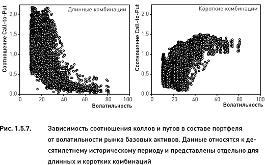 Приведенные выше рассуждения указывают на то, что структура частично-направленной стратегии содержит в себе встроенный механизм, обеспечивающий перекосы платежных функций комбинаций в ответ на изменение состояния рынка (скачки волатильности). Для того чтобы проверить эти предположения, следует проанализировать непосредственную зависимость соотношения коллов и путов от уровня волатильности. (До сих пор мы рассматривали лишь опосредованное влияние волатильности через долю коротких комбинаций.) Для длинных комбинаций нами была обнаружена обратная нелинейная зависимость соотношения колл/пут от волатильности (левый график рис. 1.5.7). Интересно, что при низкой волатильности (в условиях спокойного рынка) исследуемое соотношение находилось в очень широком диапазоне значений, однако в кризисные периоды количество путов в длинных комбинациях всегда превышало количество коллов (это обеспечивает один из двух описанных выше механизмов регулирования риска). Как и следовало ожидать, для коротких комбинаций была установлена прямая (также нелинейная) зависимость соотношения колл/пут от волатильности (правый график рис. 1.5.7). При низкой волатильности соотношение опционов колл и пут колеблется в широком диапазоне, но, как правило, не превышает единицы (это означает, что короткие комбинации были перекошены в сторону путов). Однако рост волатильности приводит к резкому росту соотношения колл/пут. При экстремальных значениях волатильности данное соотношение превышает единицу в большинстве случаев. Таким образом, мы получили достаточно веские основания утверждать, что изменяемое в зависимости от состояния рынка, соотношение коллов и путов представляет собой автоматический (способный запускаться самостоятельно в периоды кризисов) регулятор риска опционного портфеля.