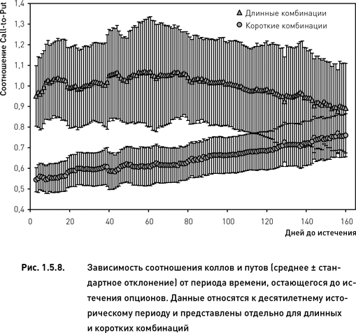 Чем более далекие опционы использовались для открытия позиций, тем меньшей была разница в структуре длинных и коротких комбинаций. Это, по всей видимости, объясняется ограниченностью горизонта истории, используемого для расчета эмпирического распределения (120 дней). На рис. 1.5.8 четко прослеживаются два противоположных тренда: в длинных комбинациях соотношение коллов и путов уменьшается по мере роста периода времени до экспирации, а в коротких комбинациях этот показатель, напротив, увеличивается. Кроме того, обращает на себя внимание тот факт, что изменчивость соотношения колл/пут (показанная на рис. 1.5.8 с помощью стандартных отклонений) существенно выше в длинных комбинациях по сравнению с короткими. Данная разница сохраняется на всем диапазоне значений периода времени до экспирации. Все эти закономерности имеют большое значение для оптимизации параметров частично-направленной стратегии.