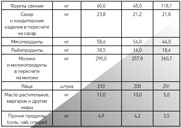 Вроде бы ничего, жить можно. Но некоторые позиции напоминают рацион если не Освенцима, то какой-нибудь захудалой африканской страны – точно. Посмотрите на графу «Масло и другие жиры», разделите числа на 365, что получается. И по пол-яйца в день на взрослого человека, по четвертинке – на детей. Не балует нас российская наука. Интересно бы сравнить эти цифры с аналогичными для нормальных «цивилизованных» стран. Но наша официальная статистика стесняется по этому поводу.