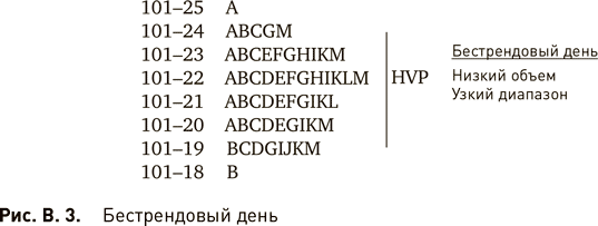 Одной из таких формаций был бестрендовый день. Это вариация дня с нормальным распределением, но в данном случае он имеет ненормально узкий диапазон от минимума до максимума и малый объем. Профиль бестрендового дня показан на рис. В. 3.