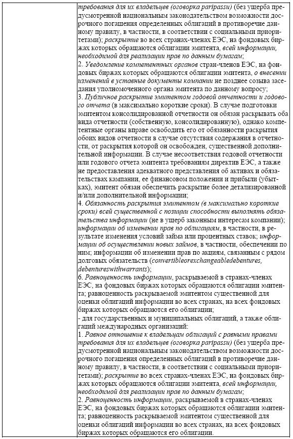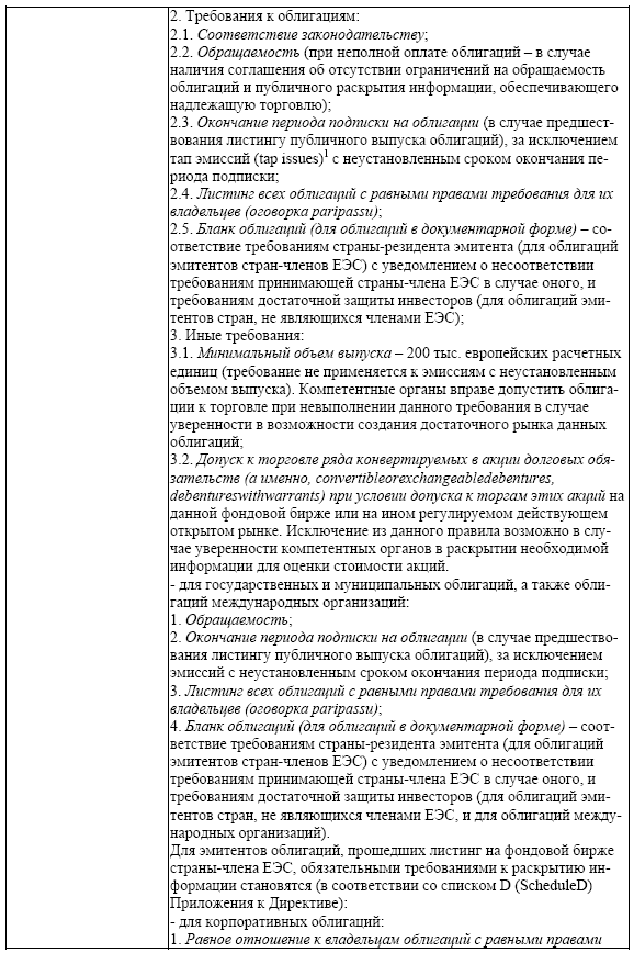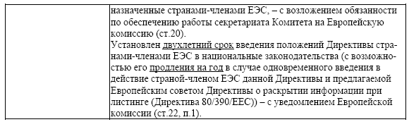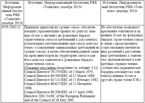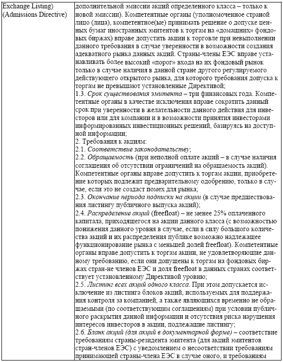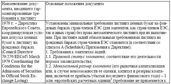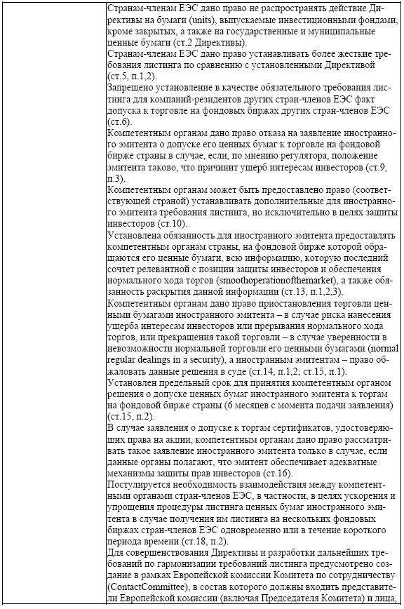 При разработке гармонизированных требований листинга ценных бумаг на фондовых биржах стран-членов Евразийского экономического союза можно учесть опыт Европейского союза в данной области (нормы начальных директив ЕЭС, регулирующих данную область) (см. таблицу 4.2).