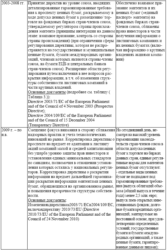 В таблице 4.1 представлена последовательность интеграции рынков стран Европейского союза в области допуска ценных бумаг к торговле на биржах стран ЕС.
