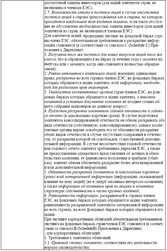 Таблица 4.2 – Гармонизированные требования к листингу ценных бумаг на биржах стран ЕЭС, установленные при начале интеграции рынков в данной области [119][120]