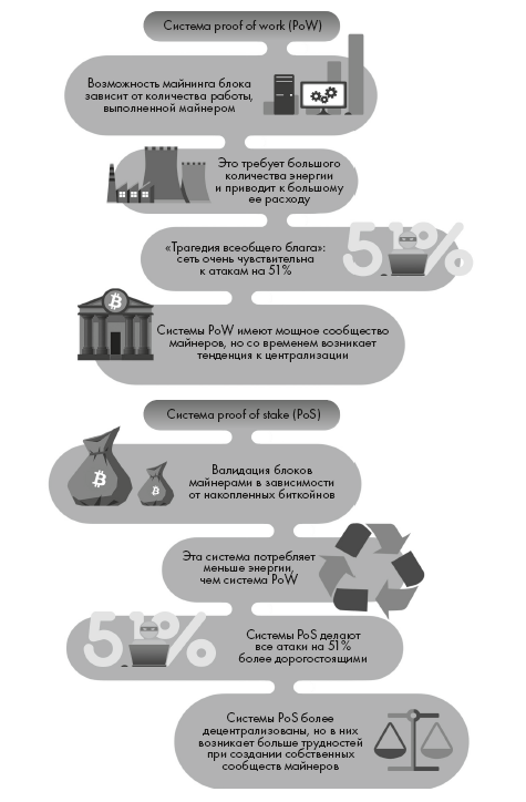 Когда мы знакомили вас с функционированием блокчейнабиткойн, мы вводили понятие proof of work, или доказательство выполнения работы (майнинг). Но теперь мы знаем, что существуют распределенные алгоритмы консенсуса, более эффективные (в зависимости от варианта применения) и менее энергоемкие, чем proof of work.