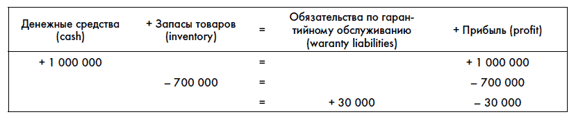 Несколько иначе обычно учитываются затраты по гарантийному обслуживанию. Суть обязательств продавца или изготовителя по гарантии, я уверен, вы понимаете. Что фактически происходит в тот момент, когда компания продает единицу товара, по которой есть гарантийные обязательства? В этот момент у компании возникают дополнительные расходы по гарантии. Исторически компания может определить, сколько денег она тратит на исполнение своих гарантийных обязательств на единицу продукции. Тогда свою прибыль по каждой единице продукции компания должна уменьшить на сумму этих предполагаемых дополнительных обязательств. Например, производитель автомобилей продал покупателю автомобиль за 1 млн руб. Компания знает, что в среднем на гарантийный ремонт автомобиля она тратит 30 тыс. руб. за весь гарантийный срок. В этом случае компания зарегистрирует следующие операции (предположим, что себестоимость автомобиля составляла 700 тыс. руб.):