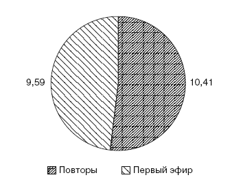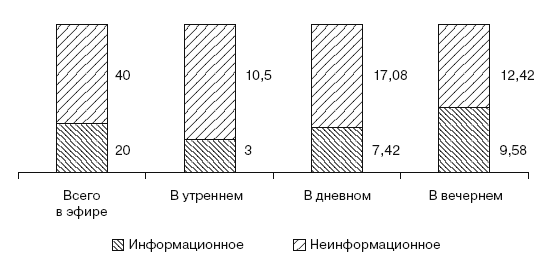 Доля информационного вещания самая высокая в вечернем эфире, а самая низкая – в утреннем. Однако необходимо отметить, что больше половины информационного вещания приходится на повторы информационных передач, которые выходят на всех каналах днем на следующий день после эфира (рис. 1.20).