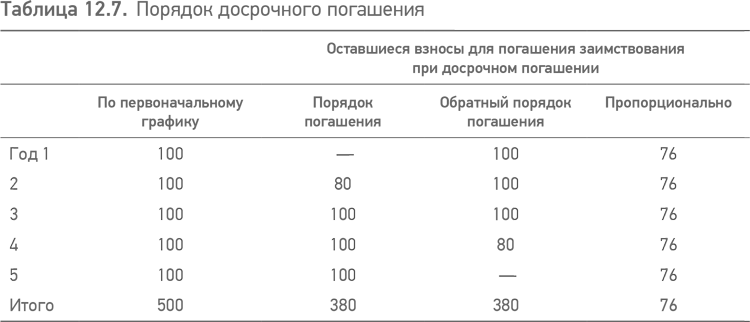 Главный вопрос, который возникает при частичном раннем погашении кредита (вне зависимости, обязательный он или добровольный), заключается в том, к какому будущему взносу в счет погашения кредита следует его отнести. Например, если ранний платеж в 120 сделан для кредита в 500, который предполагалось погасить очередными взносами за пять следующих лет, то раннее погашение можно было использовать как один из вариантов, представленных в табл. 12.7.