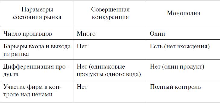 Термин «монополия» в буквальном смысле означает единственного продавца товара, но в современных условиях он используется для обозначения различных видов рыночных ситуаций, характерных для несовершенной конкуренции. Монополия – исключительное право производства, промысла, торговли и других видов деятельности, принадлежащее одному лицу, определенной группе лиц или государству. Это означает, что по своей природе монополия – прямая противоположность совершенной конкуренции (табл. 5.1).