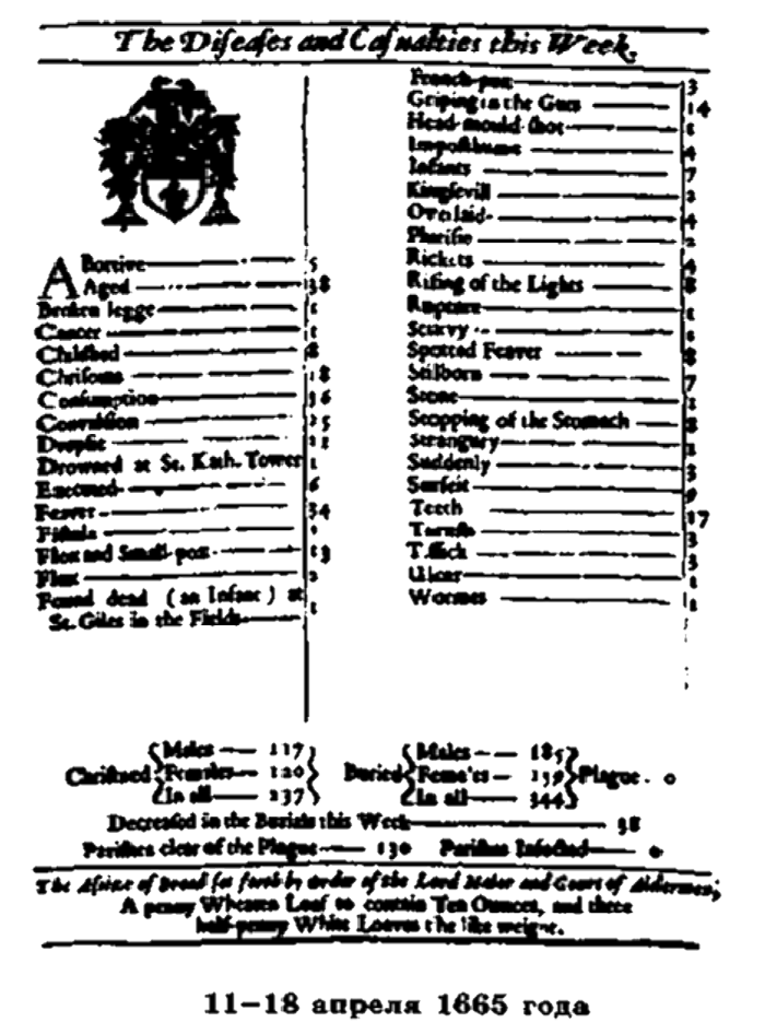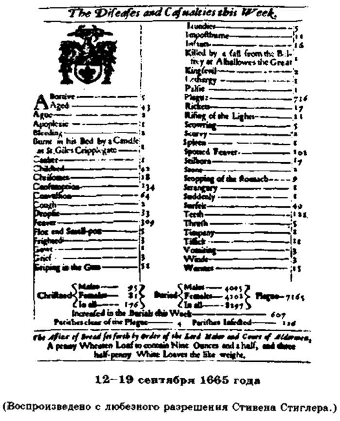 В списках указывалась причина смерти и число умерших, и из того же источника Грант почерпнул еженедельные сведения о крестинах детей. На иллюстрации представлен документ за две недели 1665 года. {1} Из документа следует, что только за одну неделю с 12 по 19 сентября умерли от чумы 7165 человек и всего четыре из 130 приходов эта болезнь миновала[11].
