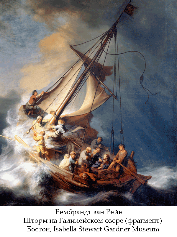...На озере поднялся бурный ветер, и заливало их волнами, и они были в опасности. И, подойдя, разбудили Его и сказали: Наставник! Наставник! погибаем. Но Он, встав, запретил ветру и волнению воды; и перестали, и сделалась тишина...