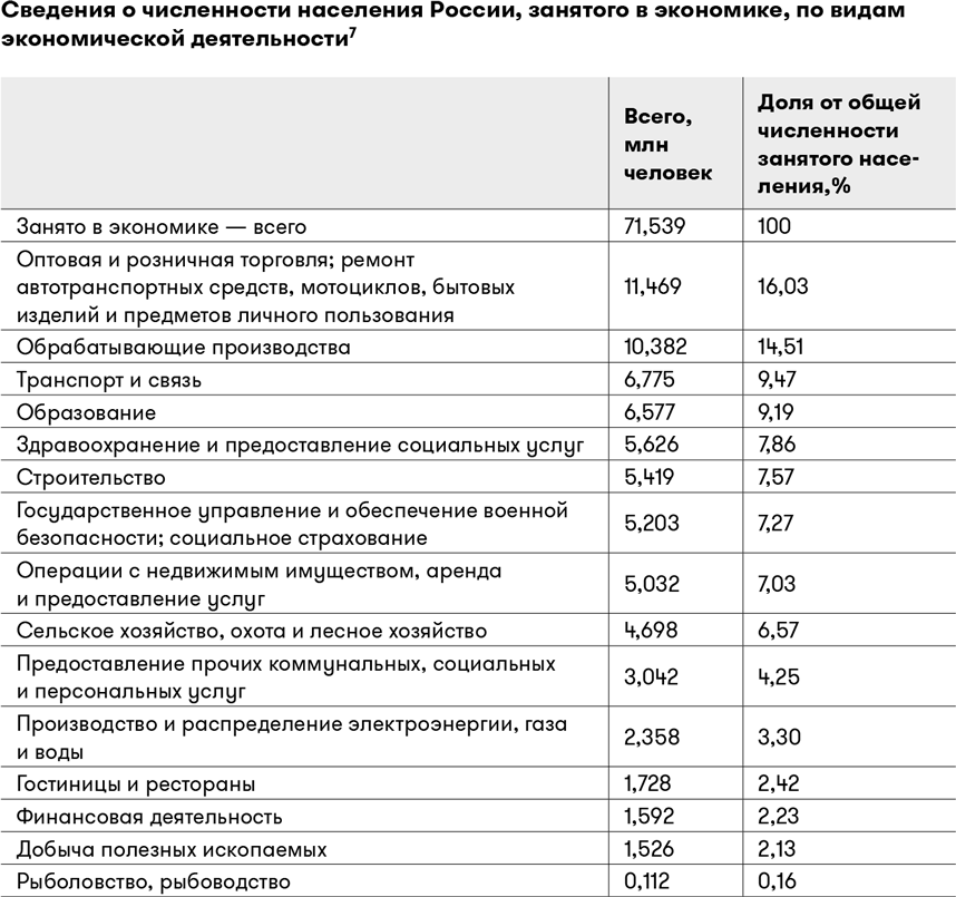 И не нужно думать, что другие виды экономической деятельности менее важны для государства. Транспорт и связь, строительство, добыча полезных ископаемых, финансовая деятельность, сельское хозяйство, торговля, обрабатывающие производства – все это составляет экономическую основу жизнедеятельности любого государства. Один лишь гостиничный и ресторанный бизнес создает 1, 728 млн рабочих мест для россиян и служит источником значительных налоговых поступлений в бюджет.