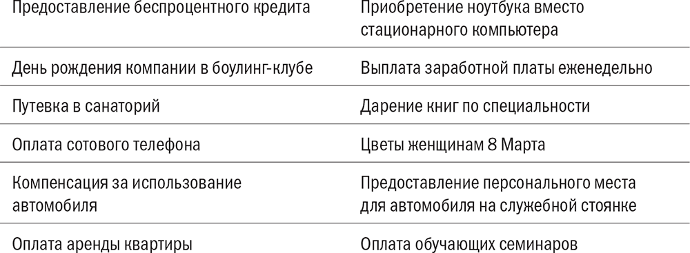 Безусловно, самый разнообразный вид поощрения – это форма, эквивалентная денежной. Эквивалентная – потому, что сотрудник получает не деньги, а что-то на них купленное, но для компании это все равно денежные расходы. И тут фантазия может быть безграничной. В табл. 11.1 приведено несколько примеров, хотя в жизни их, конечно, гораздо больше.