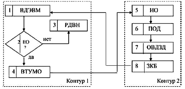 Схема состоит из контура 1 – этапы, выполняемые посредством ЭВМ, и контура 2 – этапы, выполняемые вручную. На этапе 1 происходит ввод данных в ЭВМ (ВДЭВМ). На этапе 2 проводится анализ входных документов посредством программ контроля правильности входных данных (ЕО?). При отсутствии ошибки документ на этапе 3 размещается на внешнем накопителе ЭВМ (РДВН). Если ошибка обнаружена, то на этапе 4 сведения о ней выводятся на терминальное устройство (ВТУМО), например, дисплей или принтер. На этапе 5 происходит идентификация ошибки (ИО). Затем на этапе 6 выполняется обращение к массиву первичных документов и поиск соответствующего ошибочного документа (ПОД). На этапе 7 происходит определение и (или) вычисление достоверного значения показателя документа (ОВДЗД). Ошибки в документах могут иметь самые различные модификации. Дефектом может быть отсутствие (пропуск) значения показателя в документо-строке (документо-графе), искажение значения показателя документа и др. Искажение значения показателя (данного в записи) может быть допущено за счёт недостающего или лишнего количества символов в значении показателя, искажения какого-либо символа, внедрения в цифровое значение алфавитного символа или наоборот, транспозиции («наползания») символов одного значения на другое и др. На этапе 8 происходит заполнение оператором «Корректировочного бланка» (3КБ) [29] достоверными значениями показателей с указанием режимов корректировки – «замена», «удаление», «вставка» и др. Далее данные «Корректировочного бланка» вводятся в ЭВМ и таким образом ошибки исправляются. Операции контура 1 по сравнению с операциями контура 2 составляют значительную долю трудозатрат и времени на этапе ввода и контроля документов в ЭВМ.