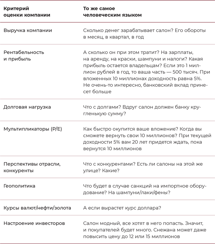 Давайте на примере салона красоты уже знакомой нам подруги Снежаны. Предположим, Снежана решила продать 50 % бизнеса и назначила цену 10 миллионов рублей. Салон красивый, бизнес вам нравится, но как понять, стоит ли он 10 миллионов? Насколько это удачное вложение? Скорее всего, вас заинтересовали бы такие вопросы.