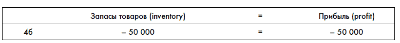 Во-вторых, мы должны помнить про принцип соответствия, который гласит, что компания должна сводить потенциальные плюсы (выручку) с минусами (издержками на получение этой выручки). Поскольку была продана половина имеющихся в запасе товаров, т. е. себестоимость товаров составила 50 000 руб. (раньше мы купили товаров на 100 000 руб., половину из которых продали), то мы должны зафиксировать следующую операцию: