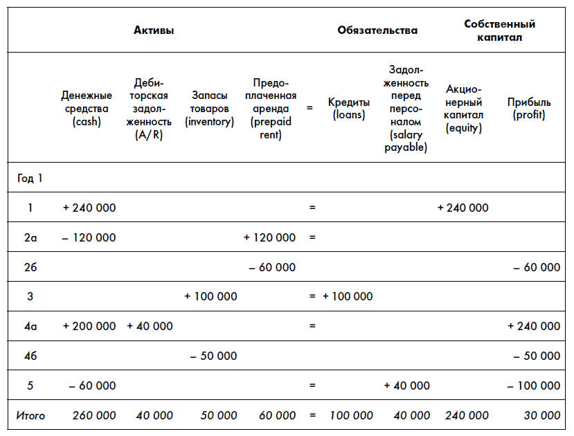 Обратите внимание, что основное равенство бухгалтерского баланса соблюдается во всех операциях компании АВС первого года.