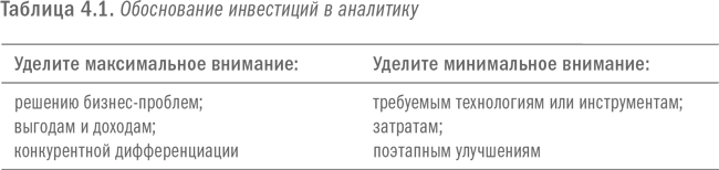 Сегодня же инструменты и технологии зачастую относительно недороги, так что можно обойтись скромными инвестициями. Выгоды, достигнутые благодаря начальным инвестициям и начальному внедрению аналитики, могут быть использованы для того, чтобы обосновать дальнейшее финансирование. Инвестиции в аналитику больше не превращаются для организации в масштабные затраты, неподъемные для бизнеса. Благодаря сегодняшней гибкой структуре затрат нередко можно начать внедрение аналитики в гораздо меньшем масштабе, и зачастую на уровне бизнес-подразделения вполне можно выполнить простой анализ рентабельности.