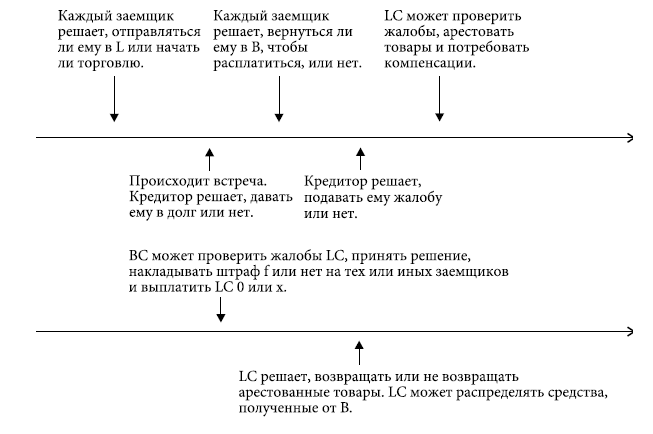 Однако когда мы вводим в игру сообщества, равновесие с кредитованием становится возможным, несмотря на конечную продолжительность жизни заемщиков и обезличенность обмена. Предположим, что есть два сообщества[312]: все заемщики – члены сообщества B, все кредиторы – члены сообщества L. У каждого сообщества есть своя территория, а все кредиты и выплаты по ним осуществляются на территории кредиторов. Каждое сообщество обладает институтом, обеспечивающим исполнение контрактов (монополией на силу принуждения) в пределах своей территории. Исторически у каждого самоуправляемого сообщества были свои суды. Соответственно пусть у заемщиков институтом обеспечения выполнения контрактов будет суд заемщиков, а у кредиторов – суд кредиторов.