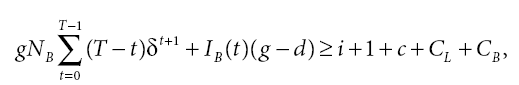 Чтобы вышеперечисленные стратегии были равновесием, ни один игрок не должен иметь возможность получить выгоду от однократного отклонения после любой истории. Если игра происходит в конфликтном состоянии, ни один игрок не может получить выгоду от такого отклонения, поскольку стратегии образуют равновесие Нэша в повторяющейся игре. В кооперативном состоянии наилучший ответ со стороны заемщика – отправиться в путешествие, вернуться и расплатиться по долгу. Путешествие, получение кредита и выплаты по нему дают g > 0, тогда как отсутствие путешествий приносит 0, а мошенничество ведет к чистому наказанию в размере – с – CL – CB < 0.