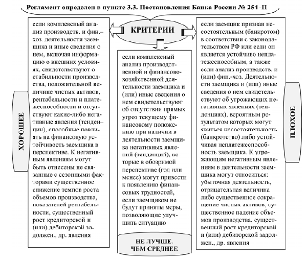 При выборе менеджментом компании варианта своей кредитной политики, помимо критериев существенности оборота денежных средств компании-заёмщика в оценке их финансового положения, следует на наш взгляд, руководствовать также ещё целым набором критерием, по которым специалисты банков финансовое положение заемщика оценивают ниже «хорошего» (п. 3.4 Положения № 254-П). Содержание обстоятельств, отнесения финансового положения компании-заёмщика к критериям: «не лучшее, чем среднее» или «плохое» описано в п. 3.4.1 Положения Банка России № 254-П.