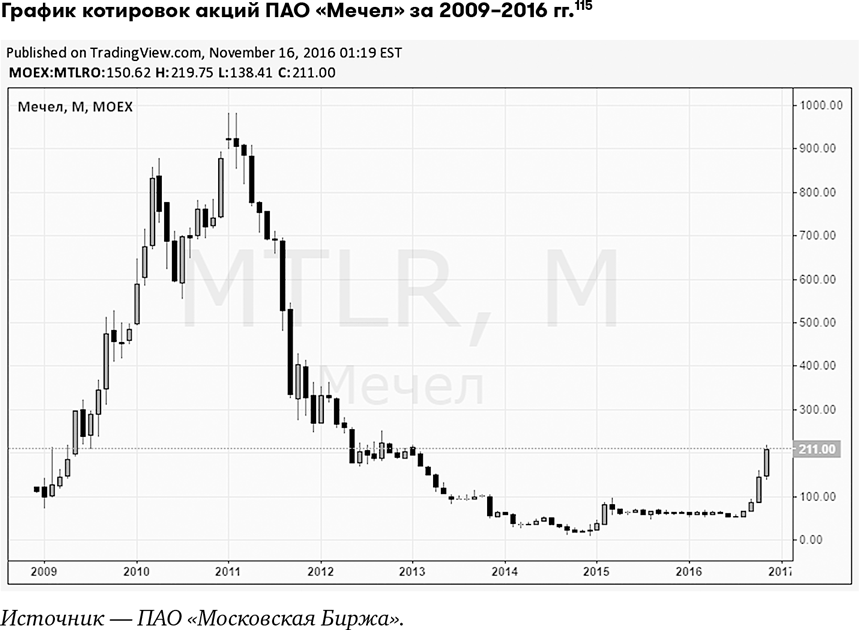 Во второй половине 2016 г. в делах компании появились изменения к лучшему. Руководству ПАО «Мечел» удалось договориться с кредиторами, крупнейшими российскими банками, о реструктуризации долгов. Если отразить реструктуризацию в бухгалтерском балансе, то некоторые краткосрочные обязательства превратились в долгосрочные. Ранее сроки уплаты по ним истекали в течение одного года, а после реструктуризации были перенесены на более поздний период. Также на мировом рынке резко возросли цены на кокс и другое сырье – основную продукцию ПАО «Мечел», что дало возможность компании впервые за последнее время показать чистую прибыль в отчетности за девять месяцев 2016 г. Эти положительные новости немедленно отразились на цене акций: буквально за два месяца она выросла почти втрое. Но даже после троекратного роста при цене 211 руб. за штуку акции все еще остаются дешевыми. От их покупки по такой цене останавливает только одно – по-прежнему тяжелое финансовое положение компании, обусловленное ее огромными долгами.