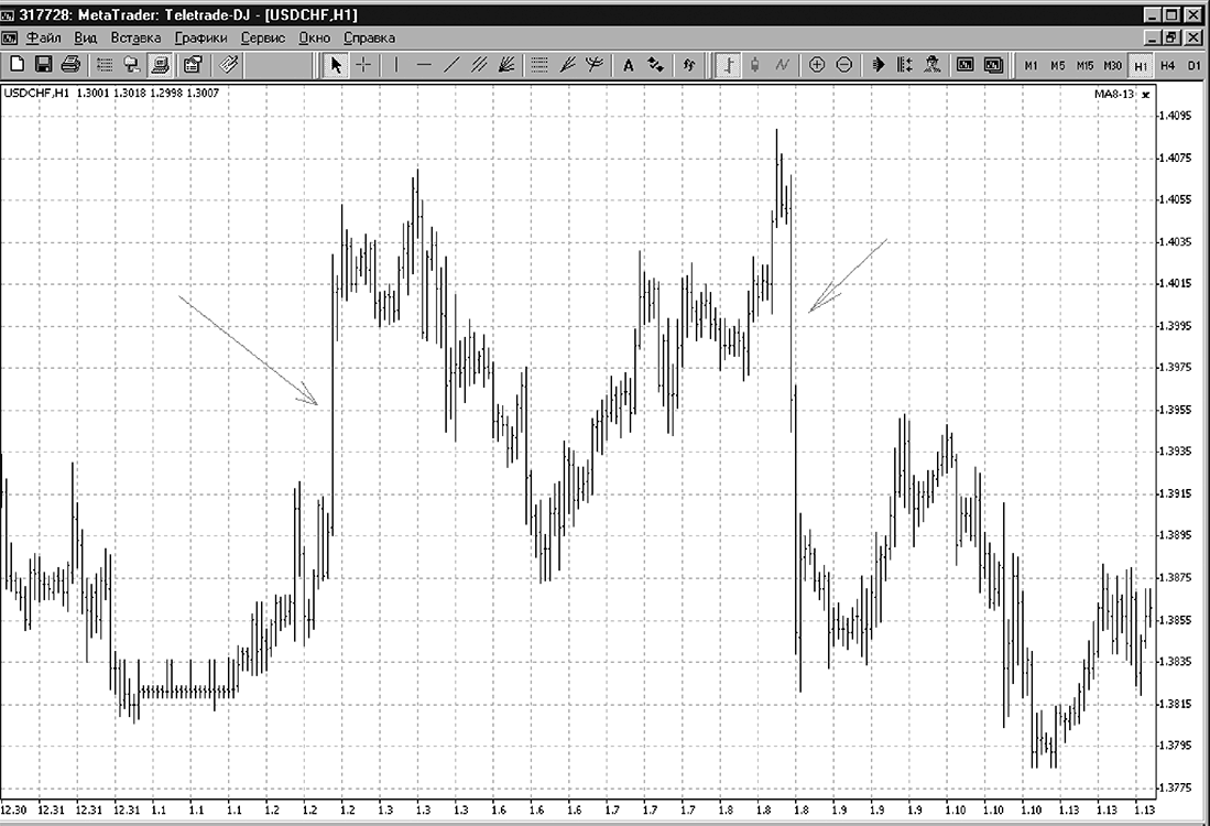 Рис. 86. График курса доллар / швейцарский франк, начало января 2003 г., период – один час. Резкий рост курса доллара в левой части графика обусловлен неожиданно хорошими данными по ISM Index за декабрь 2002 г. Столь же резкое падение курса в правой части, обусловлено очень плохими данными по сonsumer credit