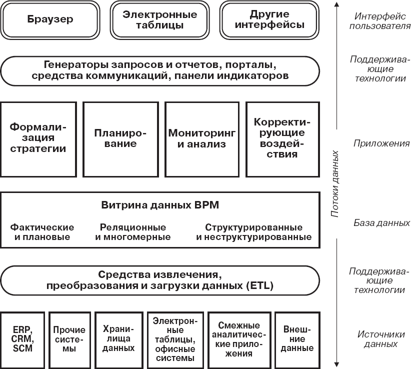 С другой стороны, было бы неверным утверждать, что BPM-система полностью покрывает все области СИП КУСМ. Дело в том, что круг вопросов информационной поддержки корпоративного управления и стратегического менеджмента весьма широк, даже без учета специфических задач, отражающих отраслевые или индивидуальные особенности. Поэтому помимо BPM-решений в СИП КУСМ находят применение и другие аналитические системы, основанные как на количественной информации, так и на экспертных оценках. Именно интеграция различных решений, как входящих в состав BPM-комплекса, так и выходящих за его пределы, позволяет построить эффективную систему информационной поддержки корпоративного управления и стратегического менеджмента.