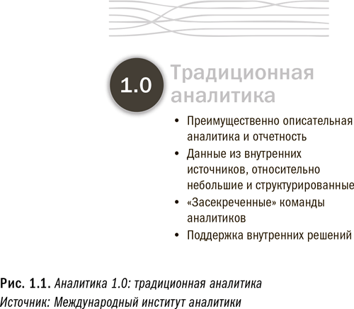 Эпоха Аналитики 1.0 на протяжении многих лет охватывала все действия организаций в сфере аналитики. Я говорю об Аналитике 1.0 в прошедшем времени, поскольку организациям следует оставить этот подход в прошлом, если они этого еще не сделали. Как показано на рис. 1.1, Аналитика 1.0 в очень большой степени опиралась на описательную статистику и отчетность с редкими вкраплениями прогностической аналитики. Предписывающей аналитики тогда не существовало. Что касается данных в эпоху Аналитики 1.0, то они поставлялись почти исключительно из внутренних источников и были хорошо структурированы. Они включали все данные, связанные со сделками организации, информацию из систем управления предприятия и т. п. Хотя в то время эти данные считались невероятно большими и сложными для обработки, по сегодняшним меркам они являются относительно малыми и простыми. Данные собирались и хранились ИТ-отделом и предоставлялись по запросу. К сожалению, чтобы сделать данные доступными для анализа, ИТ-специалистам требовалось довольно много времени. Все это ограничивало широту и глубину применения аналитики, а также ее воздействие.