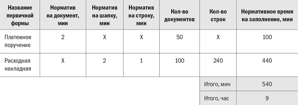 Допустим, мы установили нормативное время на ввод одного платежного поручения в информационную систему – 2 минуты. За день бухгалтером было введено 50 платежек. Умножаем 2 минуты на 50, получаем 100 минут. С накладной сложнее. Норматив на шапку – 2 минуты, норматив на строку – 1 минута. Количество документов – 100 (итого на ввод шапки 2 ? 100 = 200), количество строк – 240 (итого на ввод строк 1 ? 240 = 240). Следовательно, по нормативу должно быть израсходовано 440 минут на заполнение 100 накладных. Складываем с платежками и получаем 540 минут, или 9 часов работы бухгалтера.