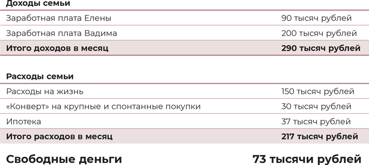 Обратите внимание: Елена и Вадим завели отдельный счет (конверт) для спонтанных крупных покупок – это и шопинг, и небольшая поездка, и техника, если понадобится. Из этого же фонда они покупают подарки. Удобно и не надо трогать запас.