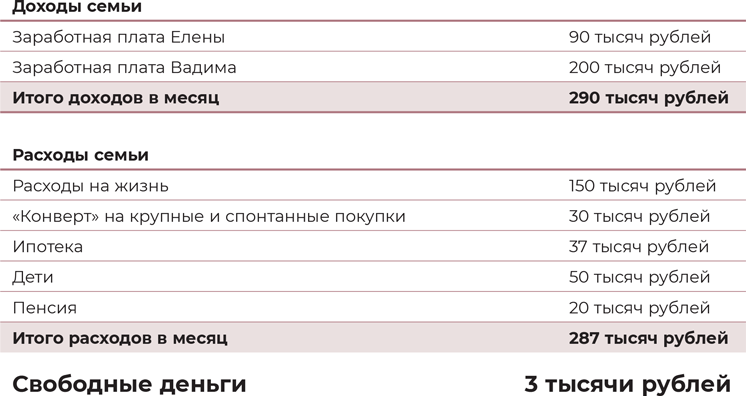 Внимательный читатель заметил, что 3 тысячи остались не у дел. Что ж, Елена и Вадим решили их не учитывать, пусть остаются на мелкие расходы.