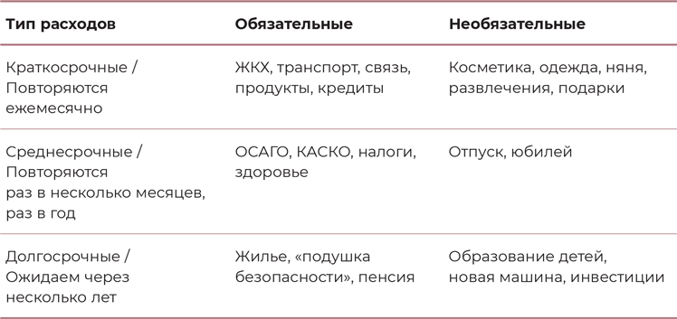 И тут есть подвох. Мы склонны учитывать только самые необходимые, краткосрочные расходы, те, которые повторяются из месяца в месяц: продукты, транспорт, маникюр, детский сад, квартплата и т. д. И при этом часто забываем про среднесрочные расходы, которые возникают раз в году: летний отпуск, новогодние подарки, фитнес-карта, налоги и страховки, медицинское обследование и пр. И уж совсем мало кто помнит о долгосрочных планах – об образовании, пенсии, о покупке жилья или авто.