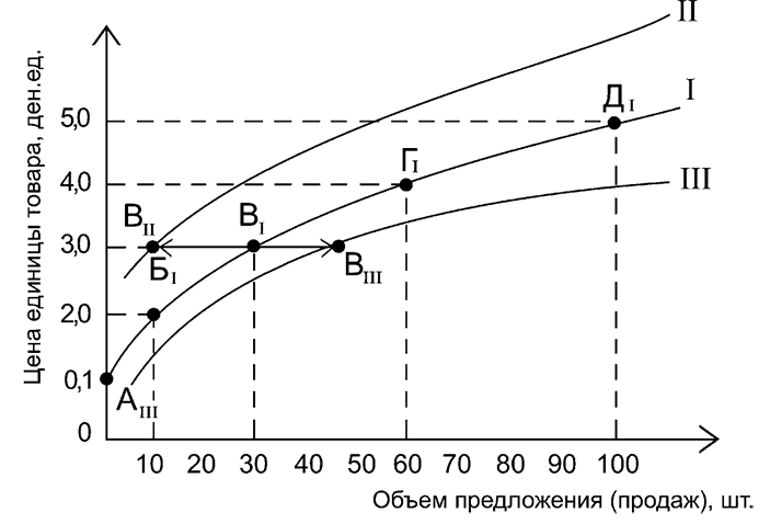 Механизм действия закона предложения показан на рис. 1.3. Кроме изменения величины предложения под влиянием цен на данный товар (при прочих равных условиях) предложение изменяется под влиянием неценовых факторов, т. е. происходит сдвиг кривой ценового предложения товара с точек Б, В, Г, Д вправо на кривую III или влево на кривую II.