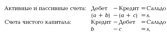 Чистый капитал представляет собой разницу между суммой имущества и обязательствами хозяйства. Для отражения хозяйственных операций в двойной бухгалтерии должно быть два ряда счетов. Ряд счетов имущественных состоит из счетов активных и пассивных, а ряд счетов чистого капитала учитывает разницу между активом и пассивом. Между этими счетами существует различие в особенностях построения. В активных и пассивных счетах дебетовая сторона имеет положительное значение и предназначается для записи активных статей, т. е. увеличивающих или улучшающих благосостояние предприятия, а кредитовая сторона имеет значение отрицательное и служит для регистрации пассивных статей, т. е. уменьшающих или ухудшающих благосостояние предприятия. В противоположность этому в счете чистого капитала дебетовая сторона имеет отрицательное значение и собирает записи пассивных статей, уменьшающих величину чистого капитала, а кредитовая сторона имеет значение положительное и предназначается для регистрации активных статей, увеличивающих сумму чистого капитала.