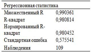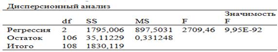 В таблице 3.3 нас интересует Значимость F, которое первоначально Excel дает в экспоненциальном виде. Но с помощью опции ФОРМАТ ЯЧЕЕК мы преобразовали его в числовой вид и убедились, что Значимость F =0,00. Следовательно, в данном случае значимость F меньше 0,01, то есть можно сделать вывод, об 1% статистической значимости полученного нами двухфакторного уравнения регрессии (или 99% уровнем надежности).