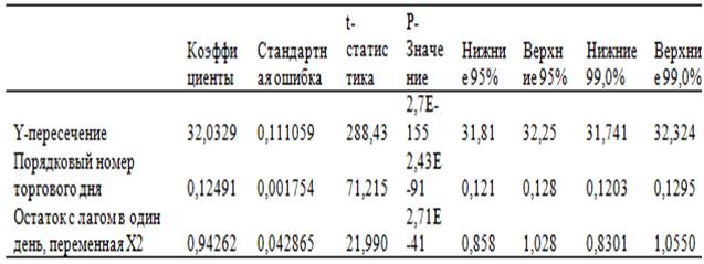 Где Y – результативная (зависимая) переменная «Курс доллара к рублю»; C – свободный член уравнения (константа) или исходный уровень тренда; A и B – коэффициенты при независмых переменных; независимые переменные Xt – «Порядковый номер торгового дня» и Xo? «Остатки с лагом в один день» (получены после решения однофакторного уравнения регрессии).