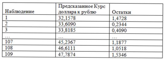 Таблица 3.1. Данные по курсу доллара к рублю, нумерации торговых дней и остаткам с лагом в один день