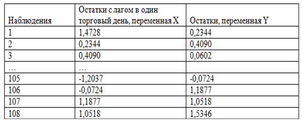 Теперь посмотрим, есть ли автокорреляция в остатках, полученных после решения двухфакторного уравнения регрессии. Поскольку мы планируем делать прогнозы с прогнозируемым горизонтом в один день, то нам нужно посмотреть – нет ли автокорреляции в остатках с лагом в один торговый день. С этой целью построим таблицу 3.7. При этом будем действовать так же, как при заполнении таблицы 2.7.